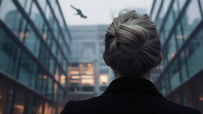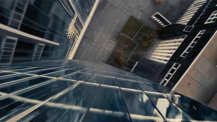 Time stretches, bends, fragments — not only in physics, but also in perception. Eternal Fall explores the paradoxical moment when reality and subjective experience of time drift apart. A woman appears to fall from the edge of a building. The camera, as if from her perspective, glides in ultra-slow motion down the mirrored facade of a high-rise. Reflections distort space, blur past and future, dissolve linearity. In a final shift, another woman watches the fall — a frozen instant between perception and projection. The work traps a fleeting moment in repetition, merging past, present, and future into a suspended loop — a moment between observation and projection, between reality and reflection. The monumental scale of the projection in the darkened space enhances the physical presence of the image; its light and motion dominate the room. The immersive scale of the projection breaks down the boundary between image and viewer. The fall is not just seen — it is experienced.