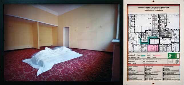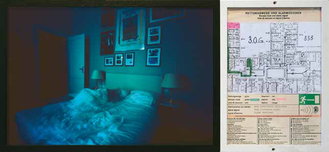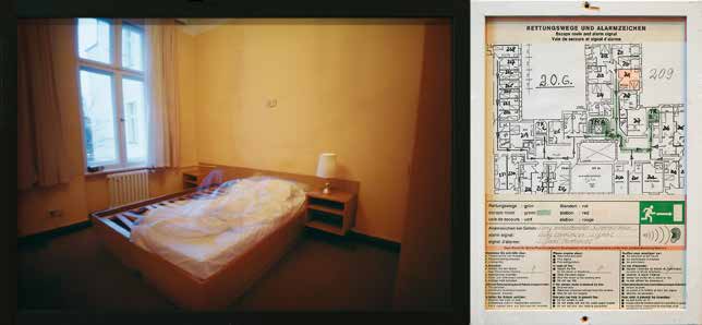 Karen Stuke used a camera obscura to photograph herself during sleep. Sleep determined the length of the exposure; after waking up, she closed the camera’s simple pinhole aperture, thus capturing the entire night in a single image. With this project at the Hotel Bogota, Stuke continued an earlier series of images entitled Sleeping Sister, which refers to Robert Schneider’s novel Brather of Sleep. The novel in turn refers to Greek mythology, in particular to Hypnos, the god of sleep, and his brother Thanatos, the god of death. Against this mythological and literary backdrop, the Hotel Bogota series brings up the complex history of the building in Schlüterstraße in BerlinCharlottenburg: from famous Yva’s photo studio to its use by the National Socialist Chamber of Culture, its later function as a place of denazification after 1945 and finally as the Hotel Bogota. The Berlin artist recorded 44 rooms until the last night before the closure of the hotel on 23 December 2013.