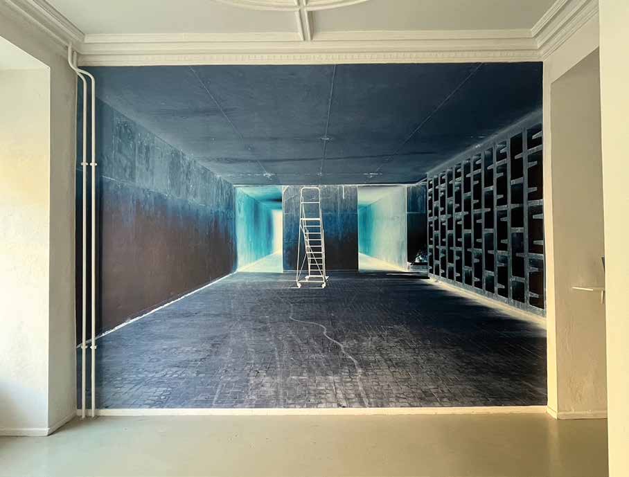 In dieser Fotoinstallation werden wir zu Komplizen der tiefgründigen Einsichten des Künstlers. Während der Erzähler (hörbar über Kopfhörer) uns durch die verschiedenen Stockwerke eines unterirdischen Friedhofs in Buenos Aires führt, stehen wir klein vor monumentalen, bläulichen Bildern. Wie in einem Hörspiel lädt uns die von Kleinjan geschriebene Geschichte zu Beobachtungen ein, die den Anstoß zur Entfaltung eines persönlichen Gedankenuniversums geben. Assoziationen und poetische Erkundungen verwandeln das ferne, monumentale Bild in eine tröstliche Manifestation des Lebens, das in den kleinen, alltäglichen Details dieser fremden, unterirdischen Realität sichtbar wird. Die unvermeidliche Konsequenz dieser unglaublichen Architektur ist, dass der Künstler eine Tatsache aufzeigt, die für das Bild in der Fotografie wesentlich ist: nämlich dass es auf den Dichotomien von Gegenwart und Erinnerung, Realität und Repräsentation, Positiv und Negativ sowie dem Leben selbst und dem Tod beruht. Es ist die Zerbrechlichkeit des Lebens, die die blaue Unendlichkeit wie eine kleine, aber starke orangefarbene Flamme ergänzt.