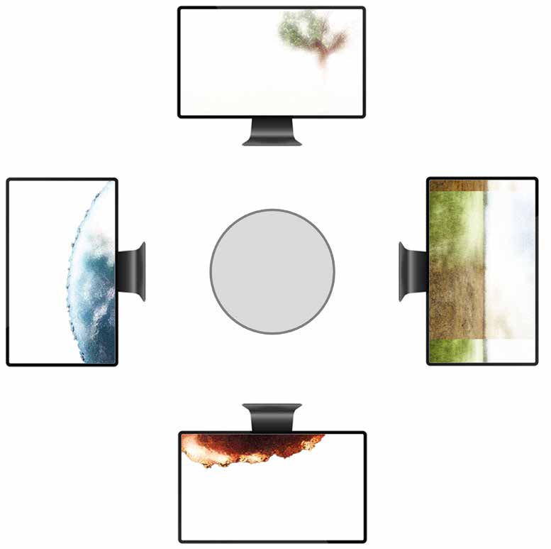 The four-channel video installation deals with the change in experienced time in relation to the cycle of the seasons. Inspired by Vivaldi’s Four Seasons, it refers to the changing rhythm of nature. One of the main themes is the shift of seasons due to climate change. Extreme temperatures, heavy rainfall and hurricanes, droughts and water shortages, rising sea temperatures and accelerated ice melt are the five main factors that show the domino effect of global warming. Do we become more aware of our own finitude when the sequence of known natural phenomena changes? Does the fact that I live on the equator or in a region with cyclical seasons affect how I view my life? Does my life change under the influence of new environmental factors? These questions will be addressed in an artistic way by means of film montage and made real through the visual experience of space-time. The continuity of time and its linear sequence are the essence of the artistic method. Four screens facing one another will form a kind of compass, with visitors sitting in the centre.